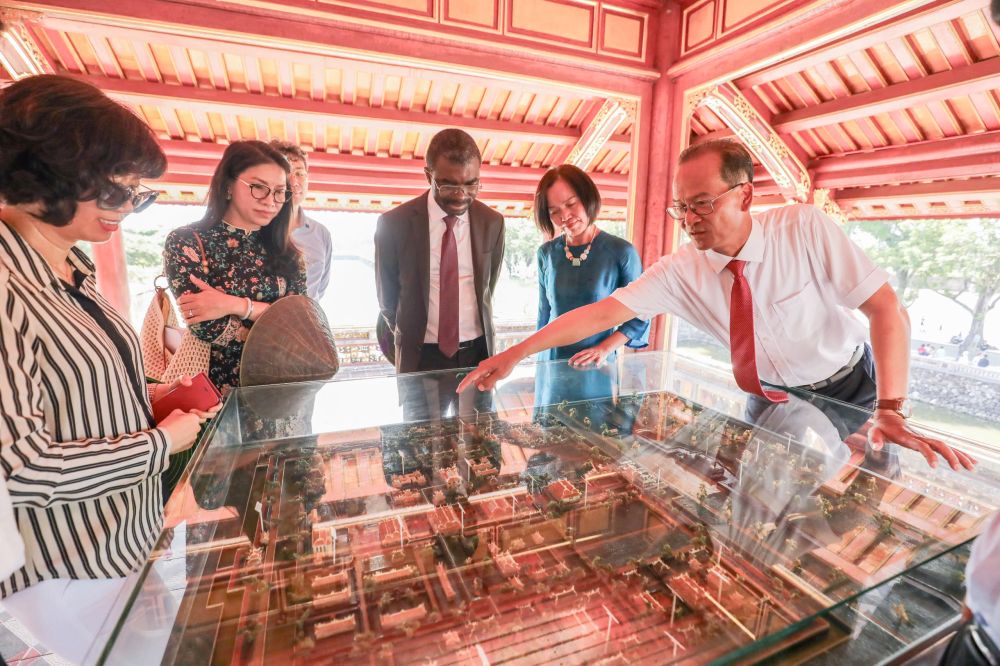 At these destinations, Mr. Lazare Eloundou Assomo was provided information regarding the formation, conservation, and development of monuments such as Hue Citadel, Thai Hoa Palace, Kien Trung Palace, etc. Mr. Hoang Viet Trung, the Director of Hue Monuments Conservation Center shared about the conservation of Hue heritage over the past time, encompassing architecture and intangible cultural heritages conservation to technology application and digital transformation.